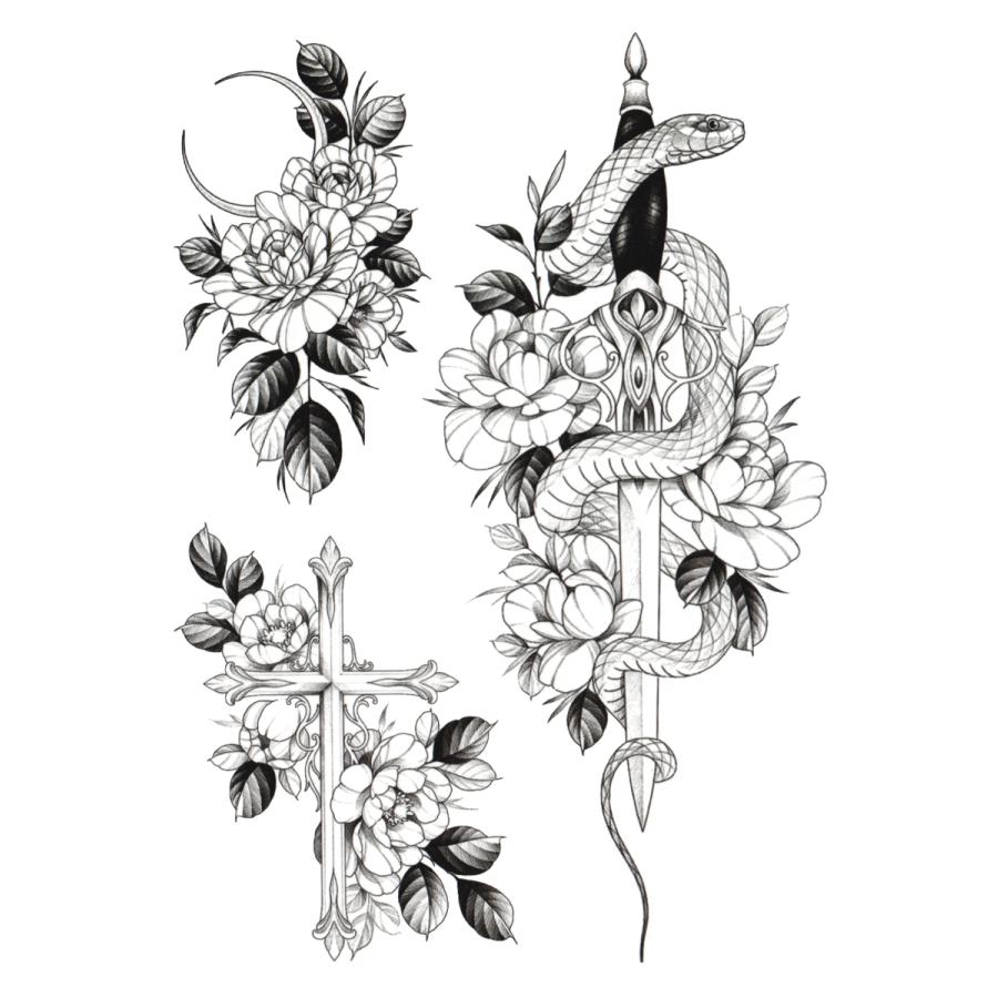 タトゥーシール 蛇 クロス 薔薇 剣 hb308【中型・A5】