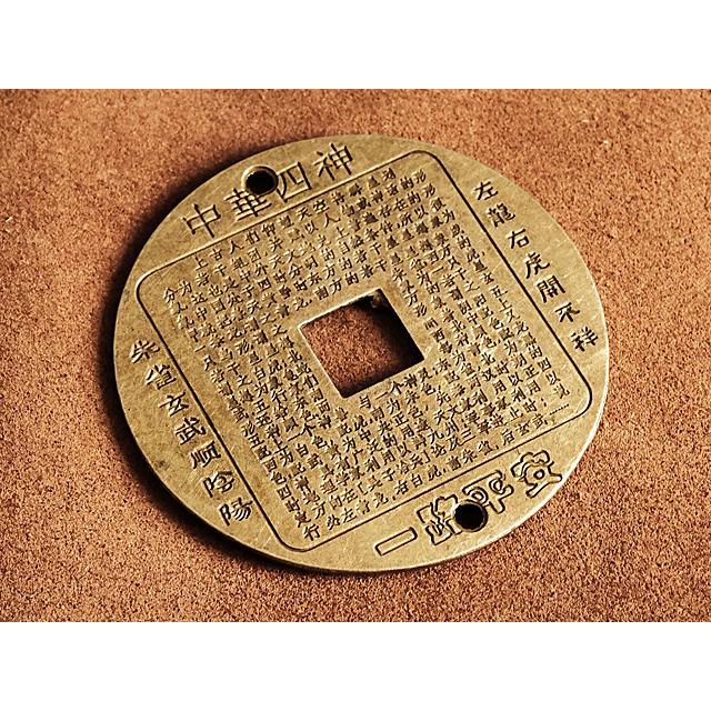 表には四神、裏側には漢文がびっしりとデザイン。