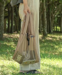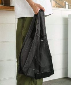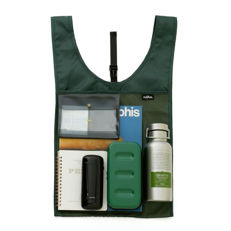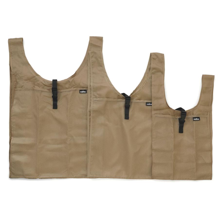 ネーエのショッパーバッグのMサイズが直営店限定で登場。大きさは2Lのペットボトルが4本収納でき、日常のお買い物であれば十分なサイズ感。前面メッシュポケットにはお財布やスマホ等を収納できるので、ちょっとしたサブバッグにも便利。バッグの口が開かないように留めたり、折りたたんでおくためのバックル付きです。